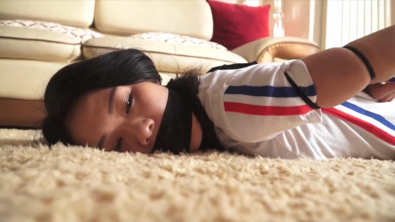 依然饰演的女白领已经被绑架了20多天,变态的女人每天对她进行各种捆绑,有个问题是劫匪已经三天三夜没有给食物自己吃了,只是每天喂一点维生素水自己喝,这天,那个变态的女人准备给自己出去买吃的,自己在家通过不断的挣扎以后终于解开了捆绑身上的所有丝袜,拖着无比虚弱的身体准备逃跑却发现门被反锁,这时听到房间里有手机铃声的响声,依然认为自己可能找到救命稻草了,没想到接了电话却是那个变态的女人打过来的,原来屋内被装了微信摄像头时刻监控着依然,她挂了电话准备拨打110报警,但是没想到手机被劫匪不知道用什么方法设置成只能接不能打的状态,这下她彻底绝望了,恐惧、绝望、疲惫的她默默的缩在墙角等着那个变态女人回来对自己的惩罚;最后活活被那个女人用丝袜全包捆绑在床上,那女人脱下自己身上的两层黑色连裤袜,一条套在依然头上,一条从外面将她的鼻子紧紧蒙住,然后躺在她身边看着她慢慢窒息而死。