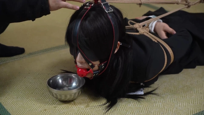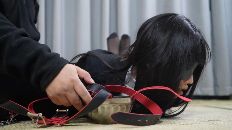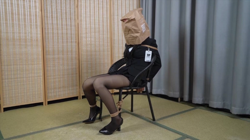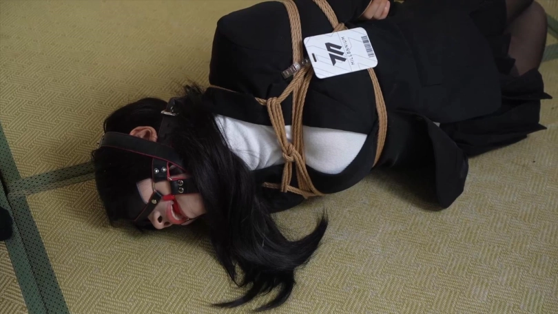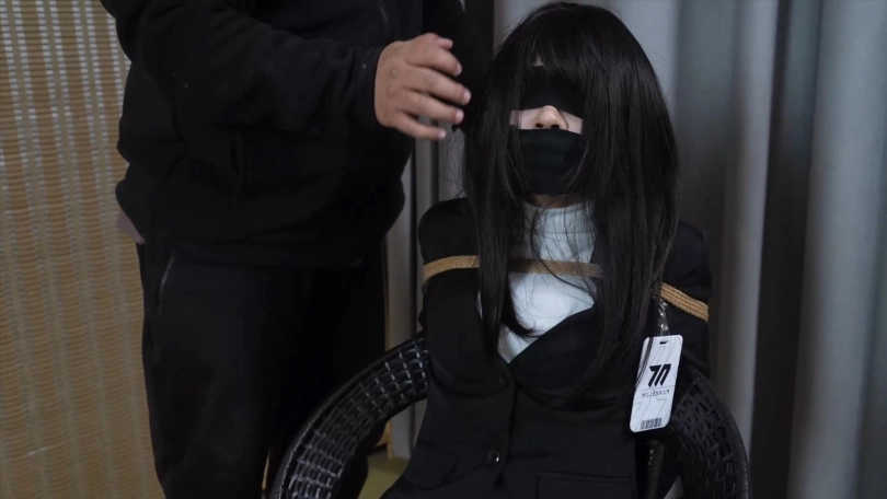 第三场景:海老缚后,胶带封嘴,肉丝套头,然后戴上全包头套,小0大喊受不了要停下来!