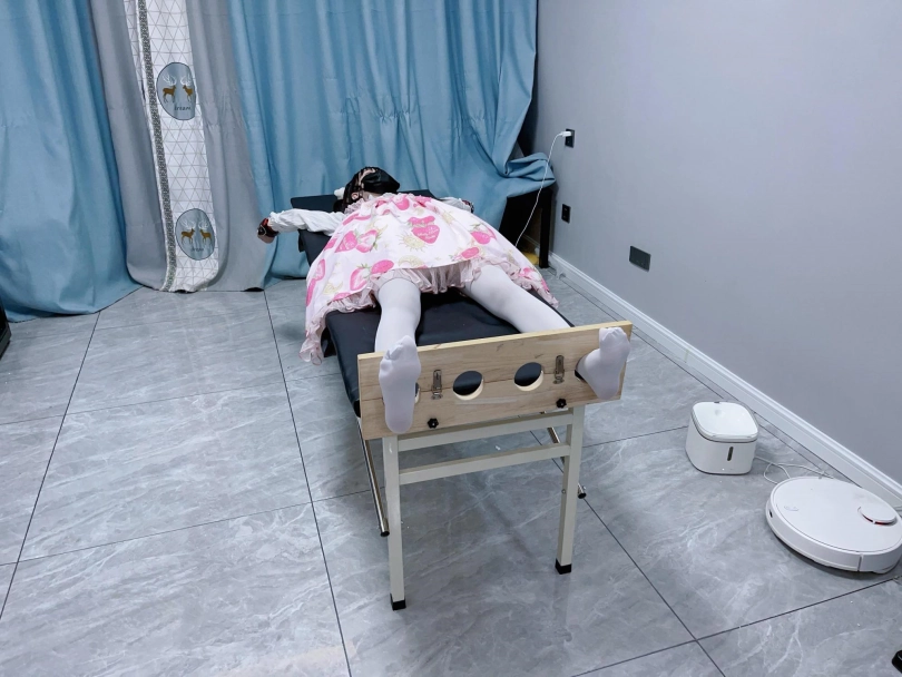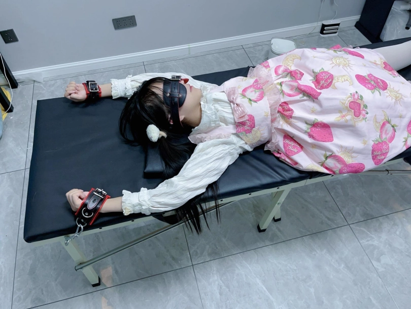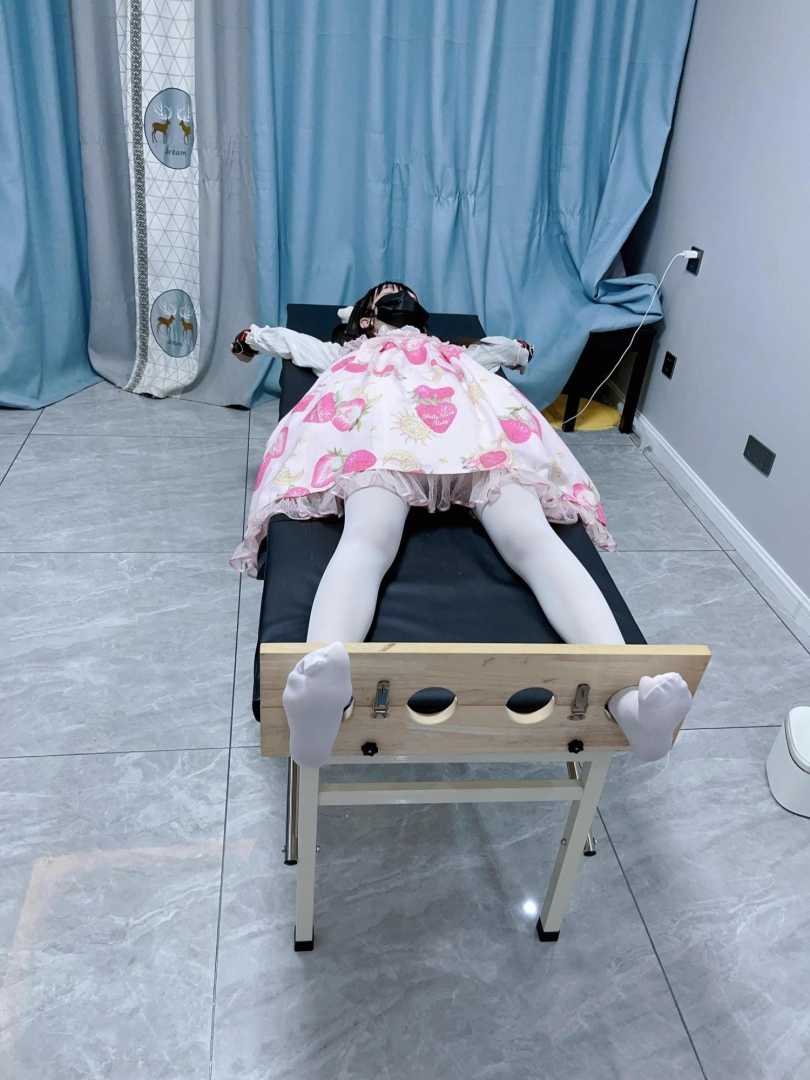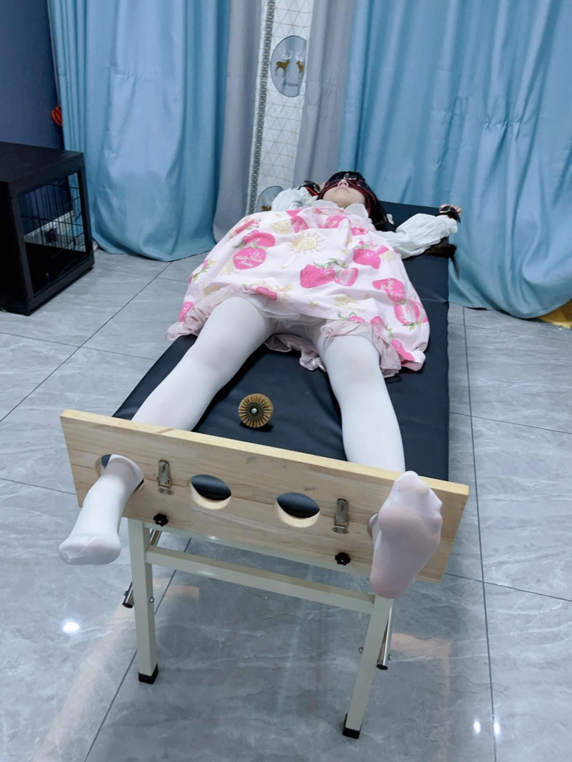 让茶茶穿着lo裙和白丝连裤袜,然后把茶茶双手举过头顶固定在痒刑床上,双脚也锁在痒刑床末端的足枷中。