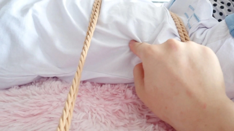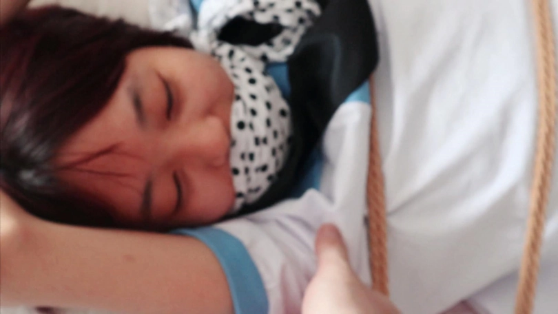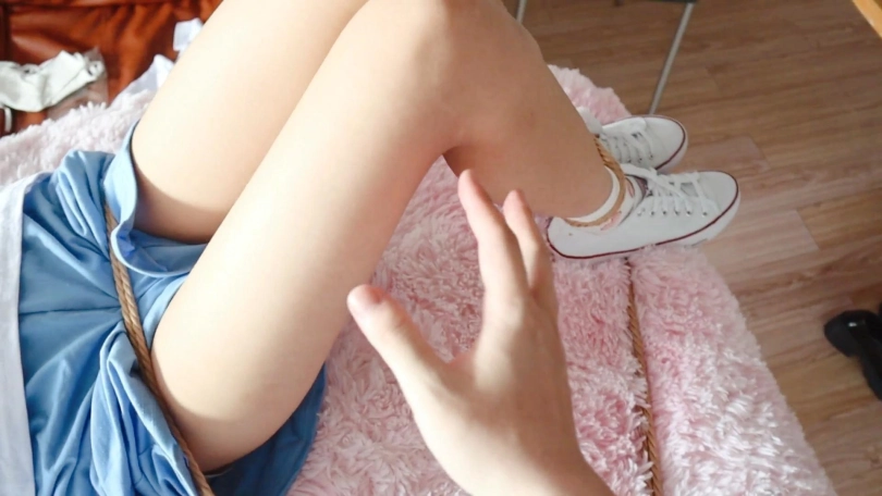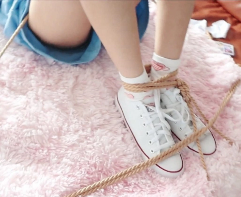 脚上的帆布鞋被紧紧绑住无助的乱蹬着鞋子被脱下 露出了白棉袜