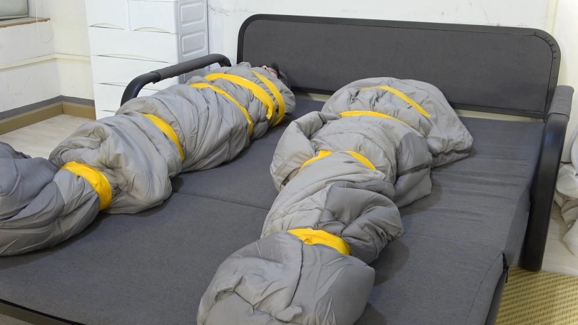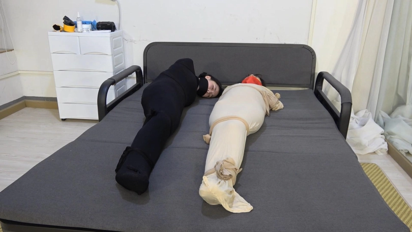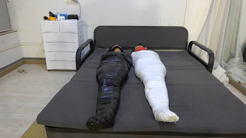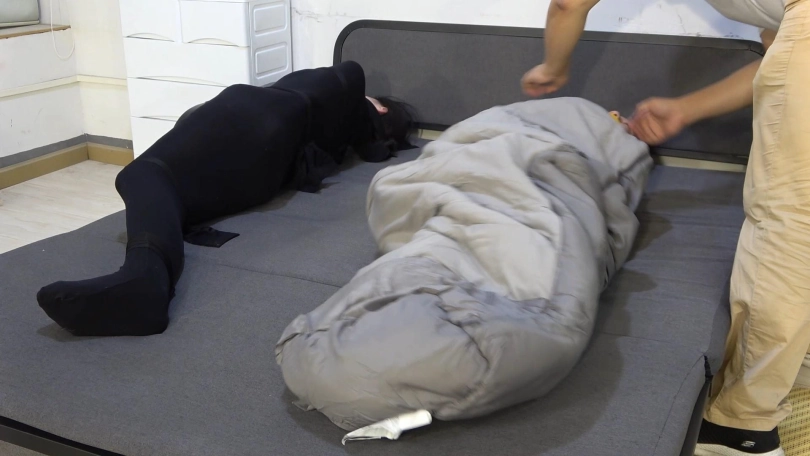 劫匪搜刮完了财物自然也不会放过两个妹子,首先把每人变成胶带木乃伊,还嫌不够又套了三层丝袜,最后怕冻坏她们又把她们装进睡袋当中,扛走贩卖掉了。