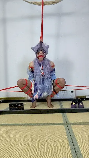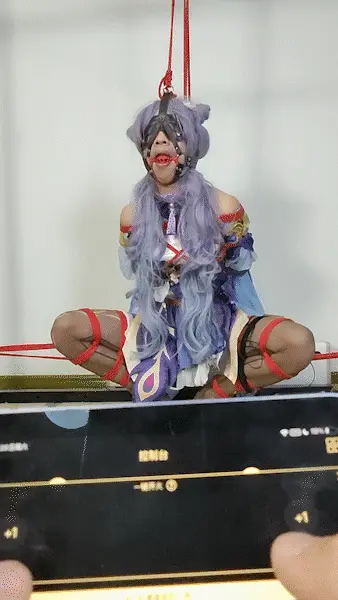 [璃月七星之一,大名鼎鼎的玉衡星——刻晴被不明来路的盗贼抓获了。他们将她结结实实地绑了起来,捆成折腿,分开固定在两侧的柱子上,再将上身吊起,让她只能够勉强跪立,同时吊起马具口塞、强迫抬头,姿势难受而又屈辱,却无法逃避。他们没有要求任何事,只是单纯的加上震动小道具和电击器不断地折磨她……]