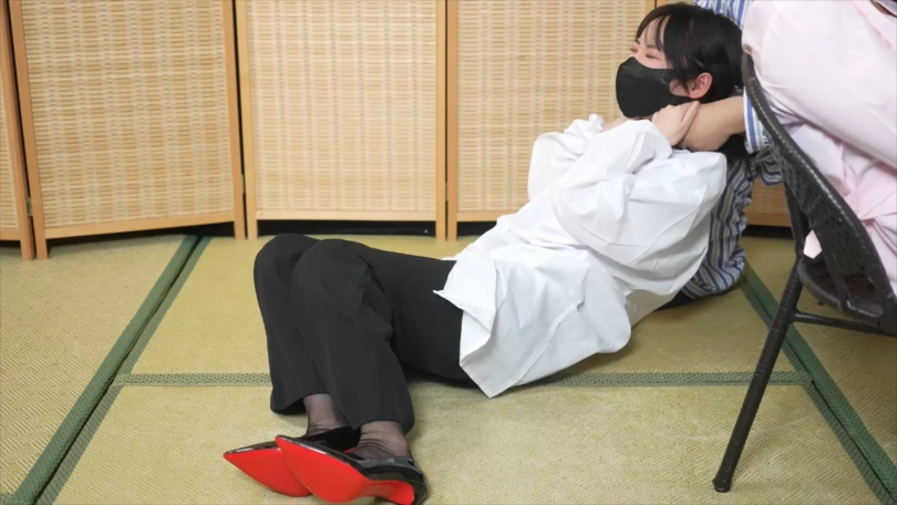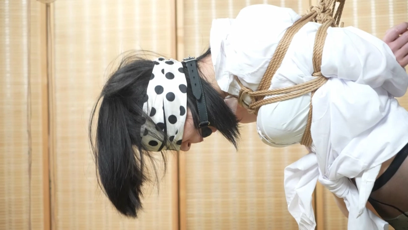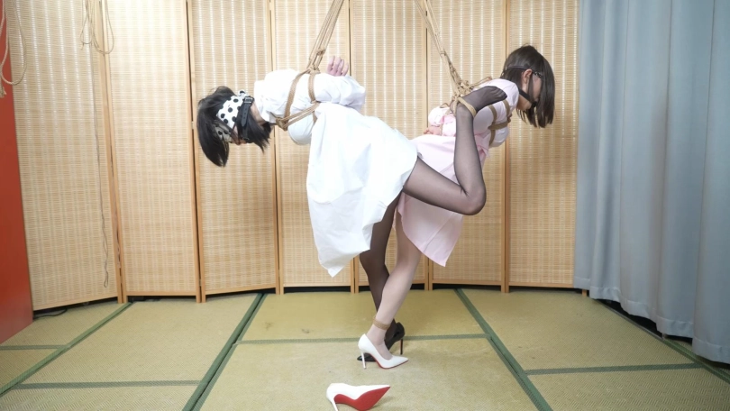 第一部分致敬了象人之前的一部作品,二人背靠背绑在一起后,双脚都被吊了起来,露出下身,十分羞耻。两位模特的挣扎十分真实。