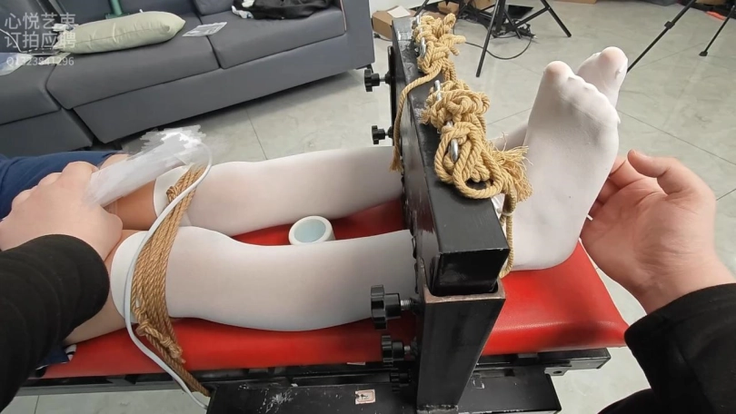 【心悦艺束】欢欢白丝单马尾老虎凳脚枷TK+强制,口球堵嘴求饶不能。
