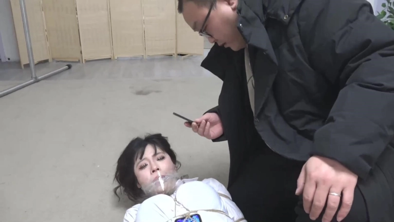 罪犯将手机缠在美女腰上,美女激动地呜呜直叫,将女演员双手头上丝袜,然后将炸弹遥控器(电动车按钮或则其他)放在美女手里最后外面用胶布缠上,按下开关,用胶布缠住美女的双眼,离开。