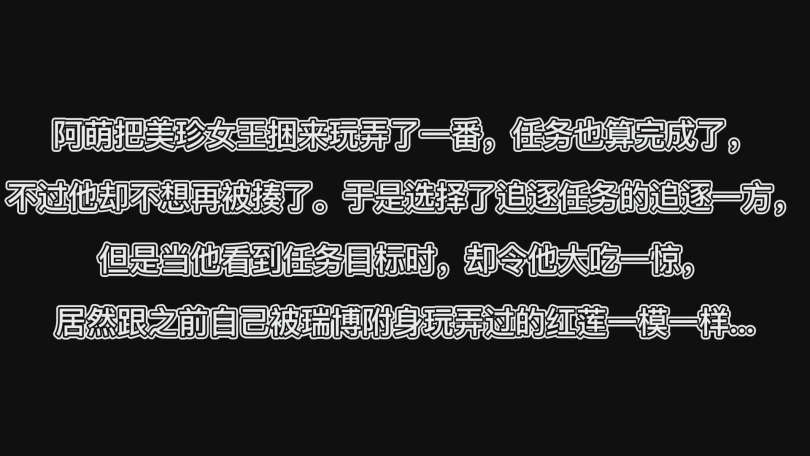 阿萌把美珍女王捆来玩弄了一番,任务也算完成了,不过他却不想再被揍了。于是选择了追逐任务的追逐一方,但是当他看到任务目标时,却令他大吃一惊,居然跟之前自己被瑞博附身玩弄过的红莲一模一样...