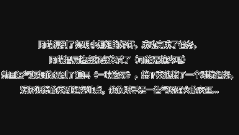 阿萌得到了舞玥小姐姐的好评,成功完成了任务,阿萌把属性点都点体质了(可能是怕疼吧)并且运气爆棚的得到了道具《一喷就晕》,接下来他接了一个对抗任务,满怀期待的来到任务地点,他的对手是一位气场强大的女王...