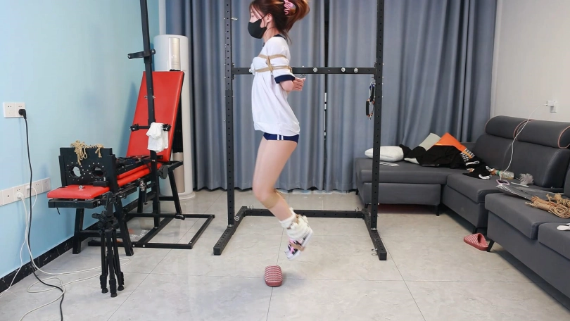 第一项挑战是捆绑手脚在鞋子上跳50个来回,消耗模特的体力。