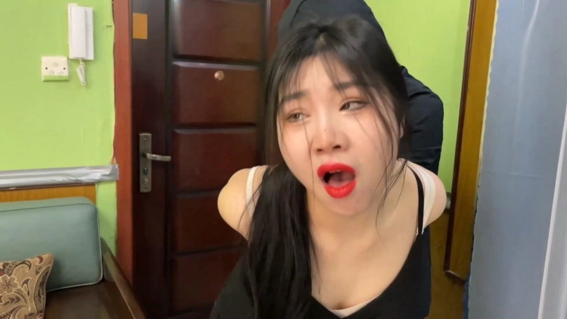 吴晗听到门铃响去开门,刘洋带着有线耳机在看手机。吴晗开门遇到了神秘的蒙面人,蒙面人拿出胶带就把她双手反扭捆绑了。吴晗一边被捆绑一边挣扎,期间一直向卧室的刘洋求救,但刘洋带着耳机玩手机一点没听到,吴晗嘴巴也被特殊的医用敷贴布封死了。