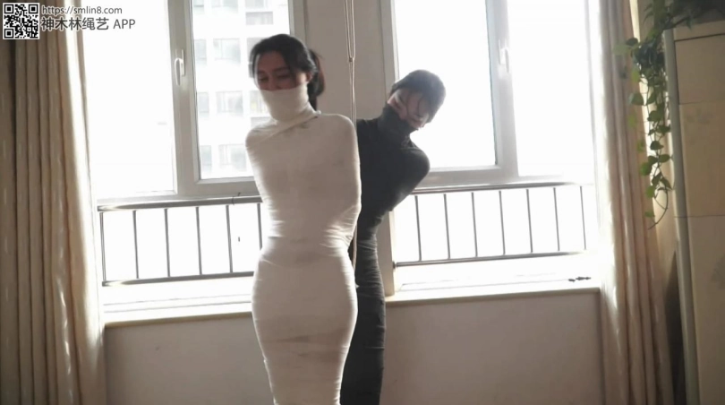 经过费力艰难的挣扎,白色木乃伊美女终于把腰部的绷带挣扎松了。