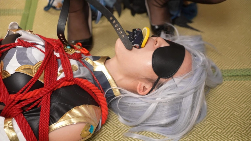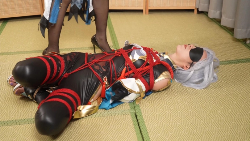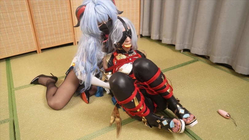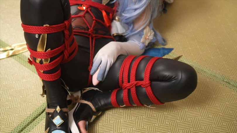 (龟甲缚打底。上身日式后高手,双脚是折腿缚)