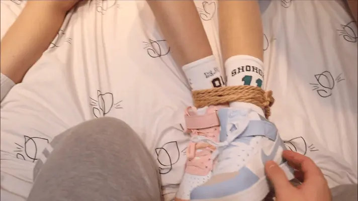 穿着篮球鞋的袜子的两个女孩的脚被捆在了一起