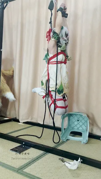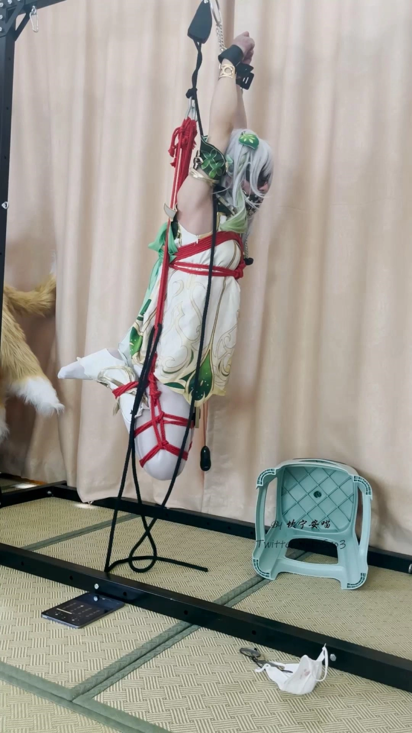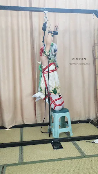这是一期自缚,角色是熟悉的草神,经典姿势——折腿吊缚!但是双手改为了前手高吊的姿势~除了常驻道具训练器外,还有电击贴片和电击gang塞~在不能解脱的痛苦中感受逐渐增强的电击却什么也做不了,中途尝试将踢倒的椅子勾回来但不出意外的失败了…