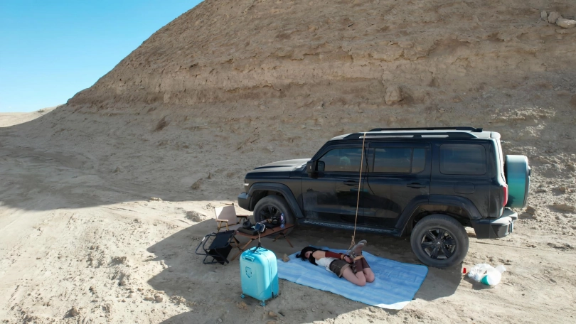 刚认识的一个大叔,戴着我去了一趟大西北,在穿越无人区沙漠的时候停下来泡壶茶然后休息一下,说好的休息一下,还没等茶泡好,就被突然绑了起来,你们是不知道这里的风沙有多大,温度有多高,感觉很快就脱水了,呼吸难受,口干舌燥,那种滋味是无法言语的,当无人机飞起来的那一刻我就知道这下是跑不了了!只有乖乖认栽。无人机的配音简直是绝绝子。