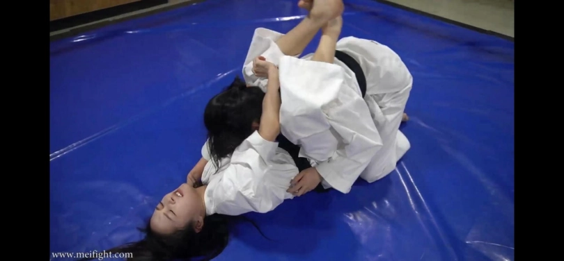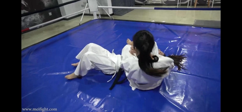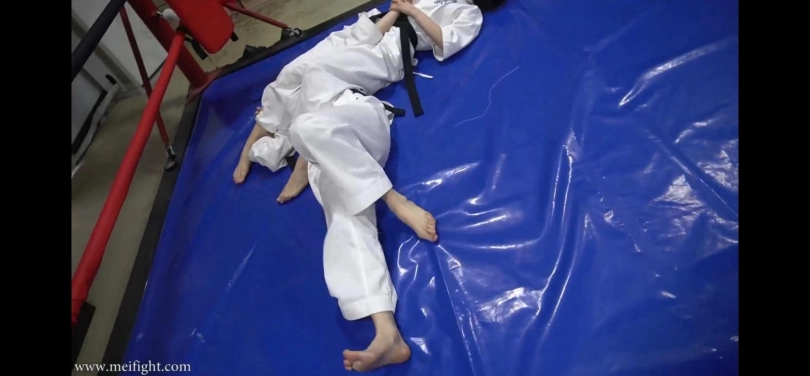 两个跆拳道女孩以为琐事大打出手,互相蹂躏对方,摆出各种羞耻姿势,最终一个女孩被打晕倒在地上。