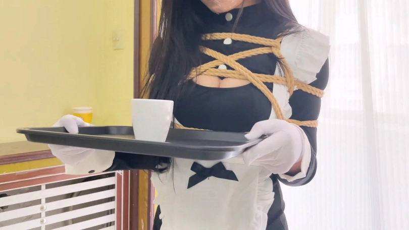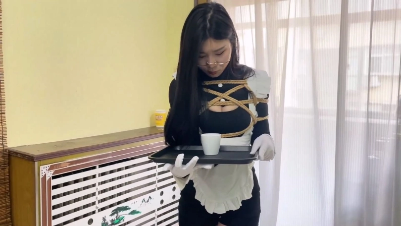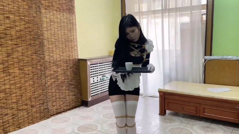 男人回家躺到沙发上,招呼女仆给他倒杯水来。美女端着盘子跌跌撞撞的向男人移动。美女双腿被捆绑只能慢慢蠕动丝袜脚。好不容易移到男人边上,男人将水一饮而尽,又将杯子放回盘子上。说要训练女仆的礼仪,不管什么情况都不能让被子翻到地上。