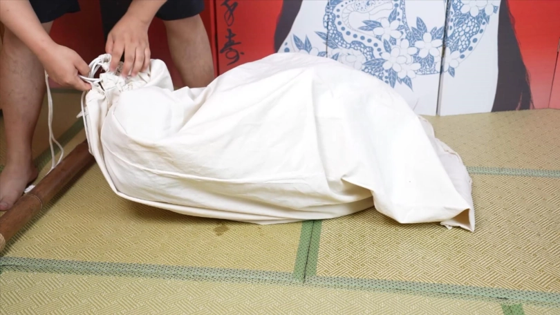 2.双脚举过头顶的海老缚,固定在竹竿上,td放置
