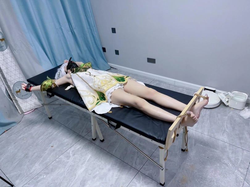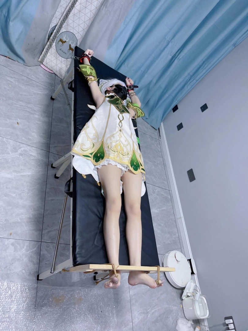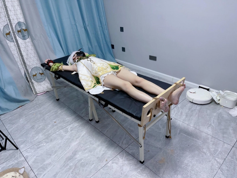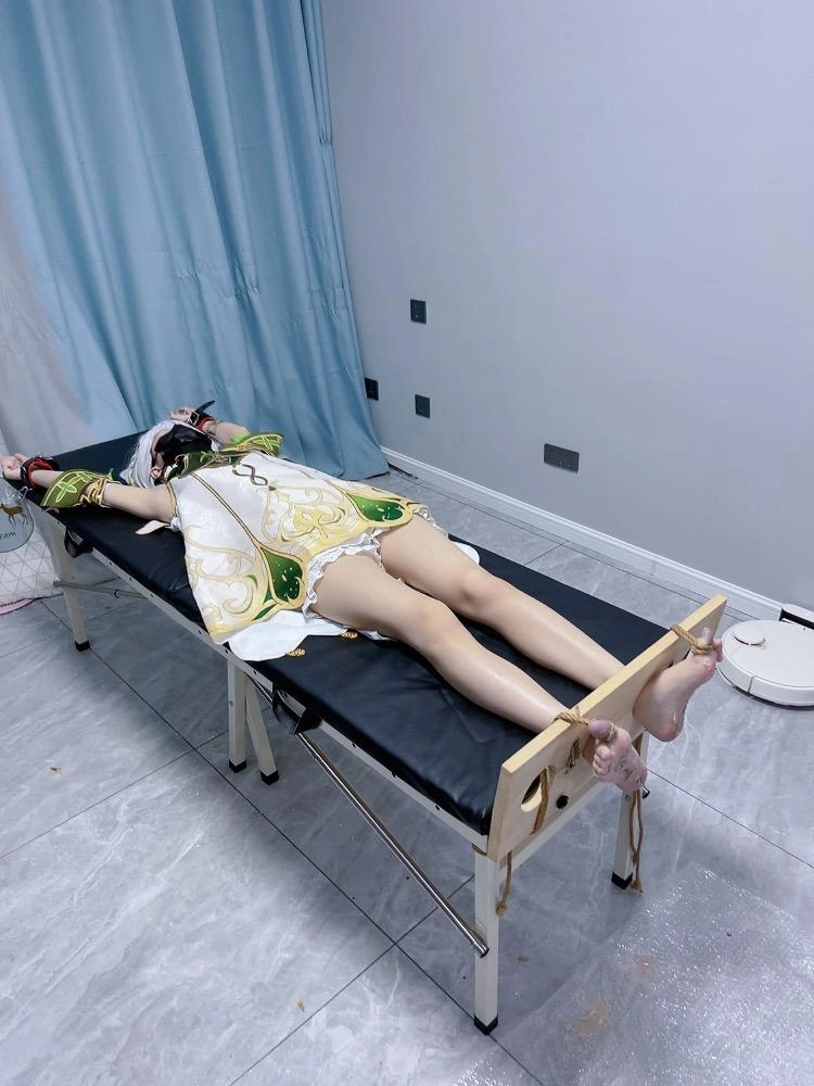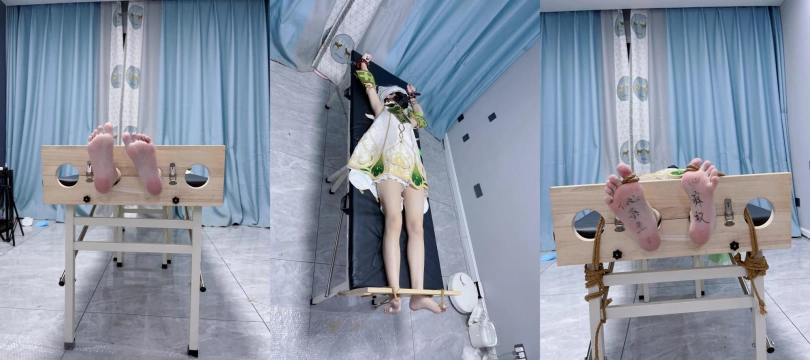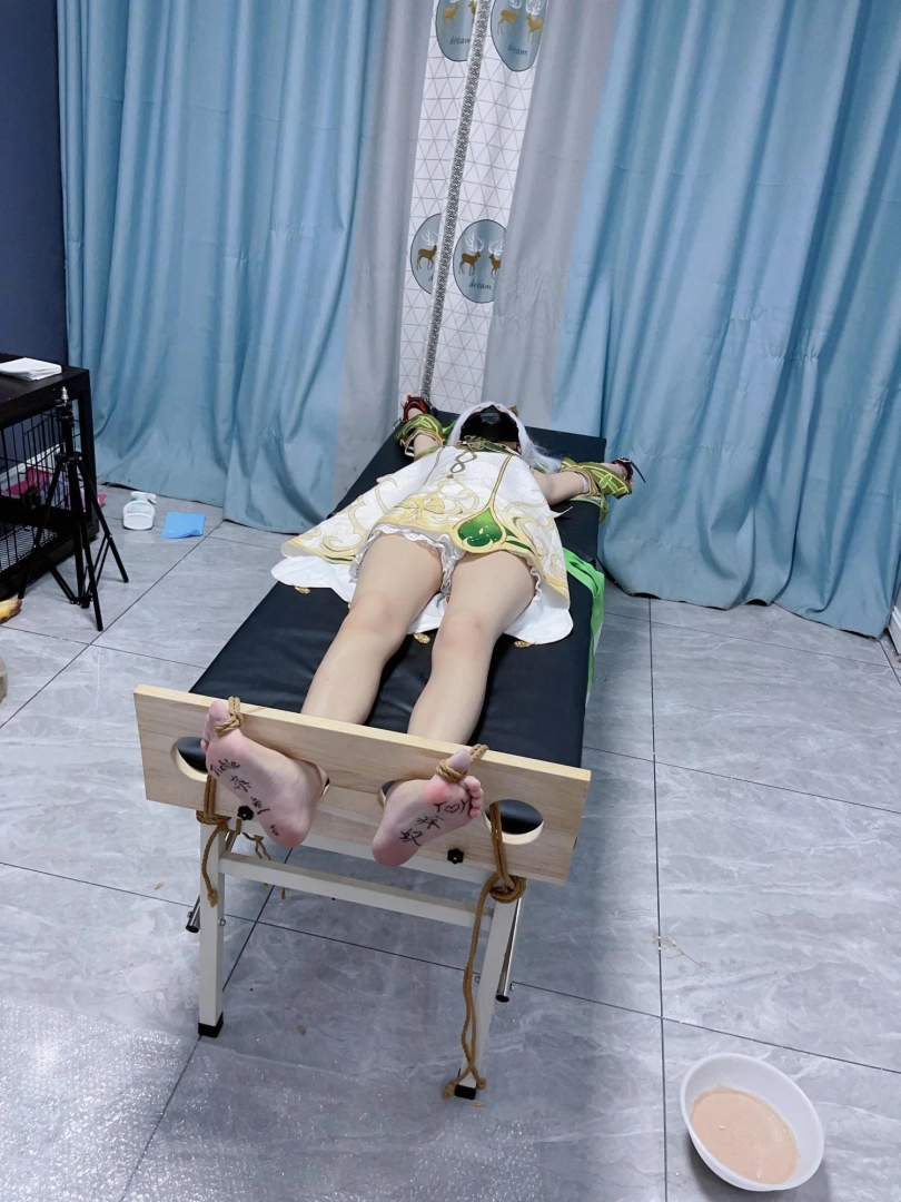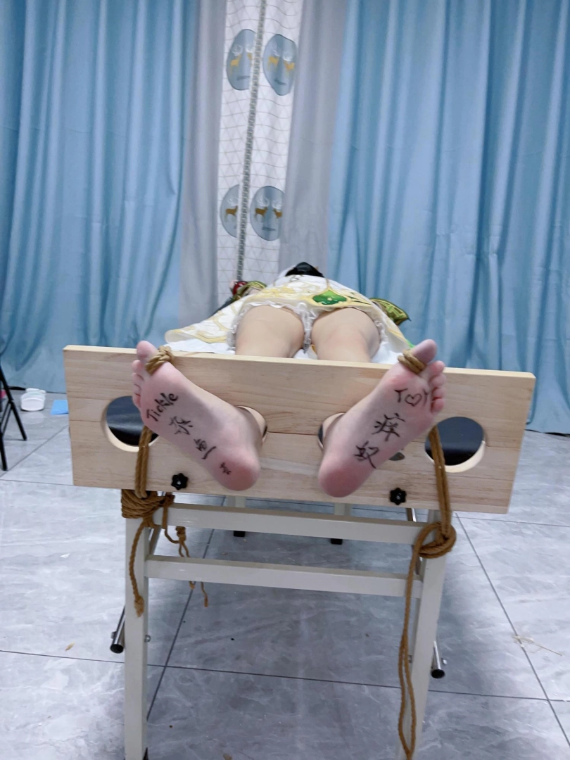 内容:先让茶茶穿着小草神纳西妲的cos服固定在痒刑床上,足枷锁好后用绳子固定好脚趾禁止乱动一丝一毫,然后在脚底写上羞耻的文字(杂鱼痒奴)(Tickle Toy)。