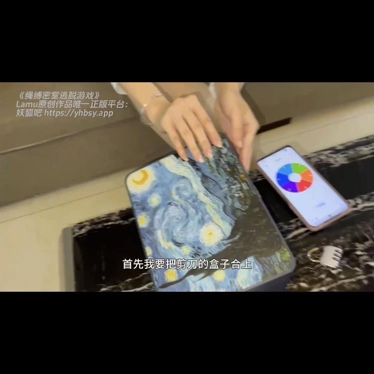楼下背铐好思思,脚也铐上,用手机抽取装剪刀盒子密码锁的密码,打开盒子拿到剪刀,去解救小伙伴。女小伙伴告诉钥匙藏在哪里,思思拿到钥匙就能解开手脚铐啦。