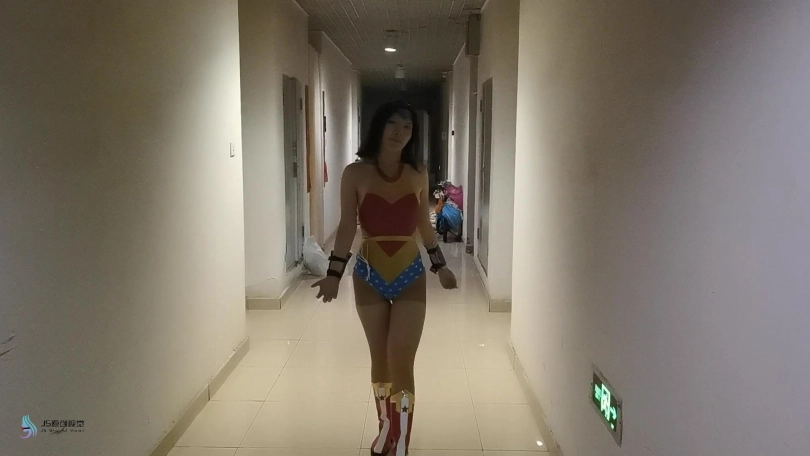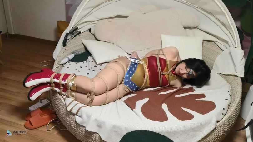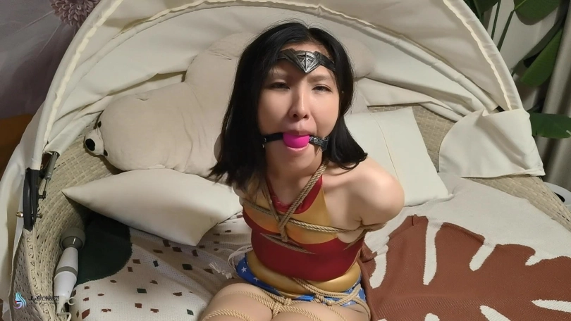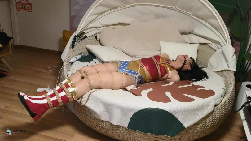 近期发生多起少女失踪案,神奇女侠来到一处房间调查。就在女侠查看时,房间突然窜出多条绳子缠住了女侠的全身。女侠惊慌的挣扎着,但她的双臂被绳子拉扯到背后牢牢捆绑着。脚上的绳子也拉紧,女侠没有站稳掉了下去。女侠的全身被绳子密密麻麻的捆绑着。这时绳子圈着一个口球塞进了女侠的嘴里,又出现一个TD放进了女侠的裆部。