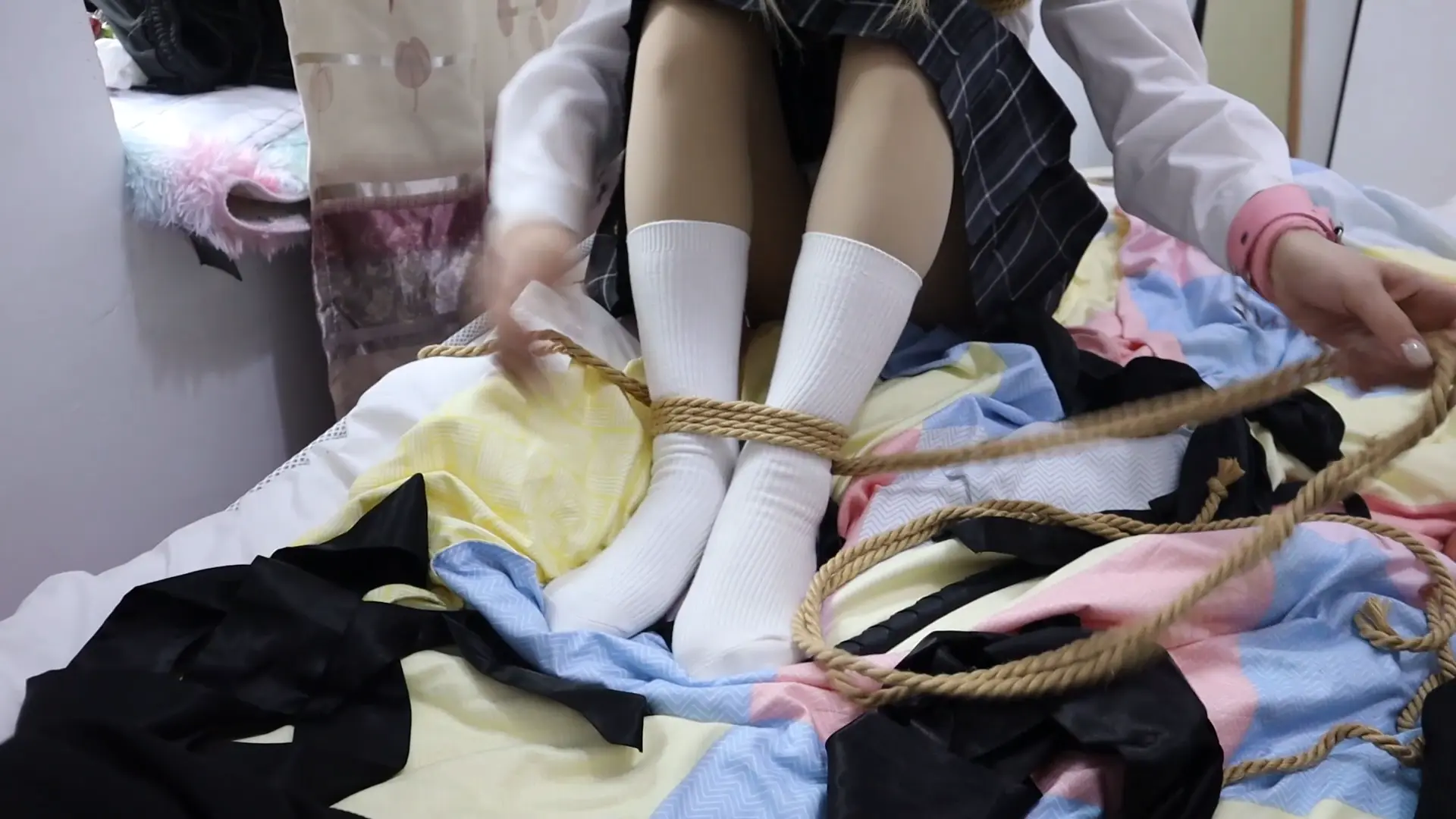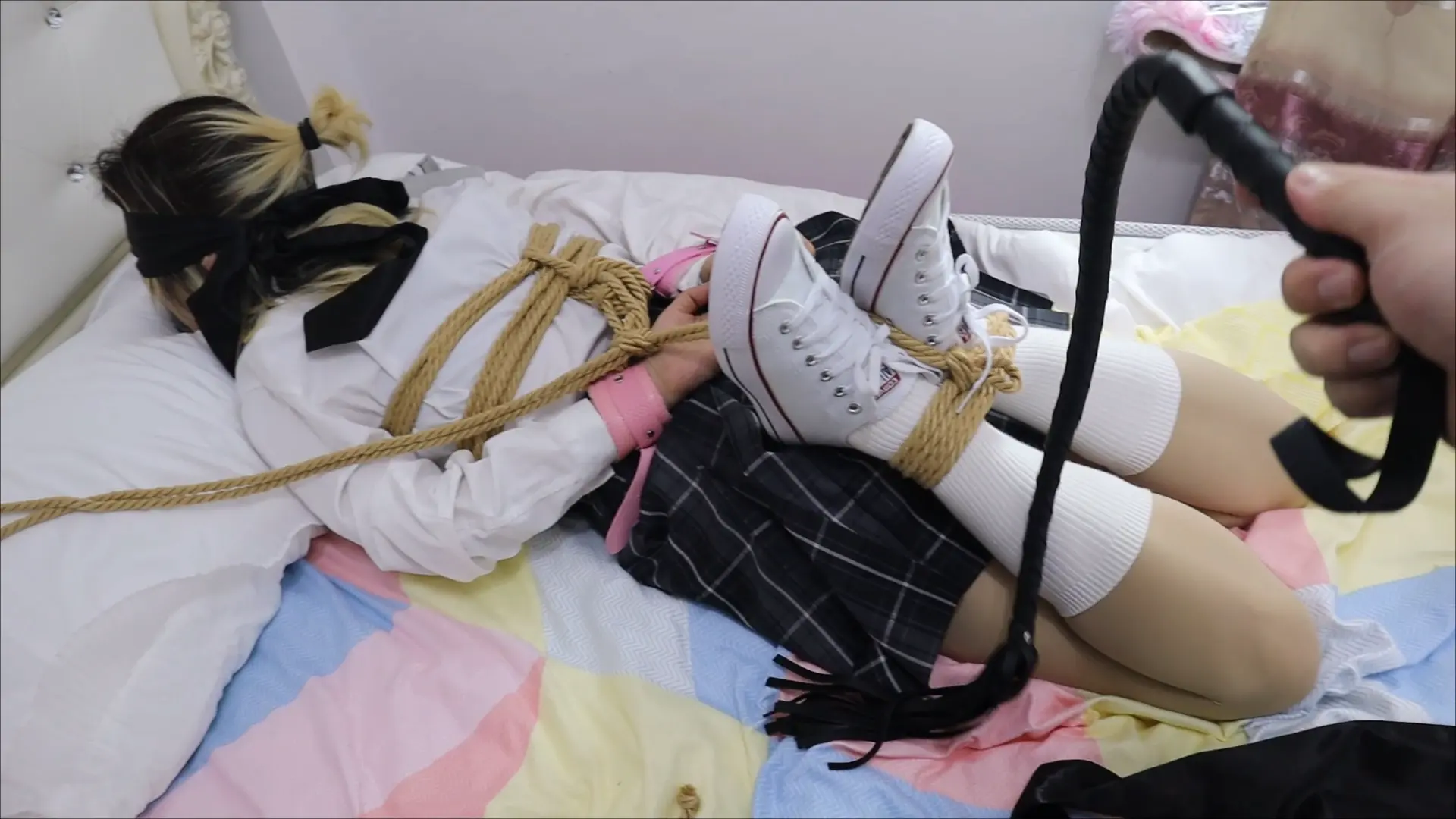 强行把布条完整塞入少女H嘴里塞满并用胶带封住,双手粉铐撩绳子拉住脚上的绳子弯曲腿部,