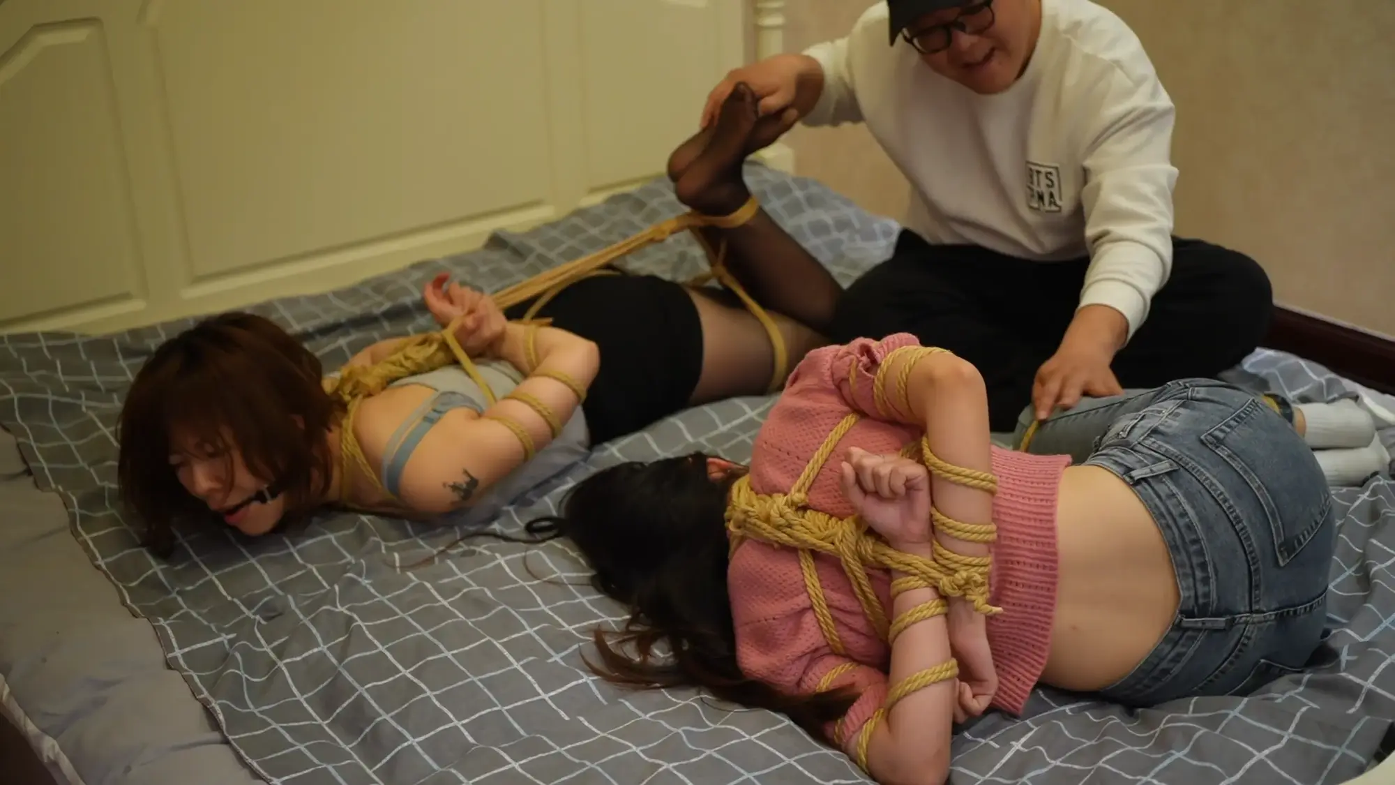 玩累的房东随后将母女两人抱到了卧室,将米粒驷马捆绑后开始挠两人的脚心,最后锁上房门任由母女两人在床上挣扎。