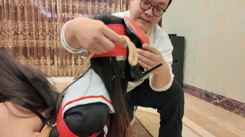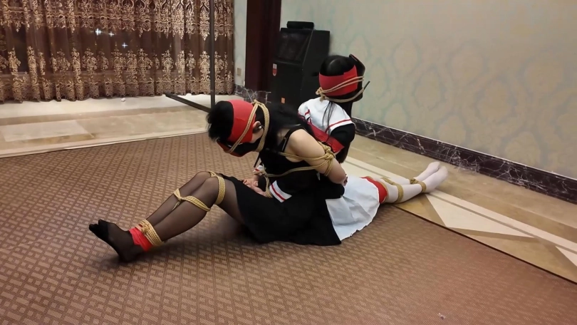 之后再放置拍摄一会。昏迷的富家女回过神来,又因为脸上的高跟鞋十分痛苦。两个人不断地挣扎,试图让身上的绳子松动,然而只是无用功。很快二人就都筋疲力尽,头颅低垂,昏迷过去。