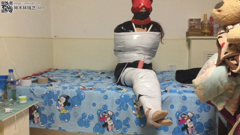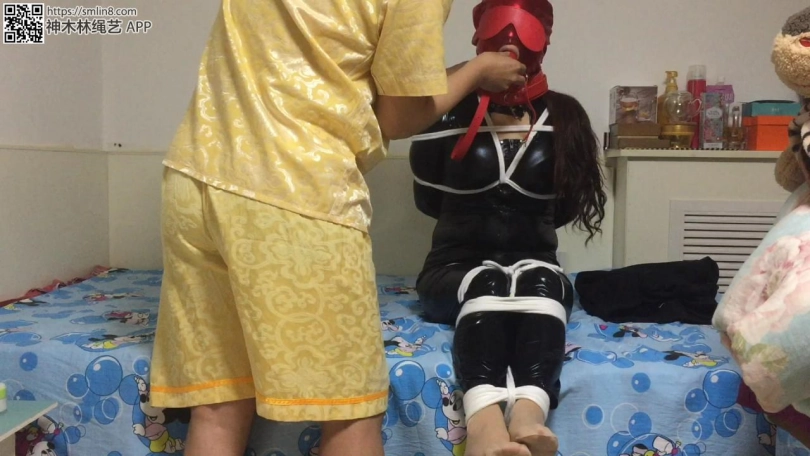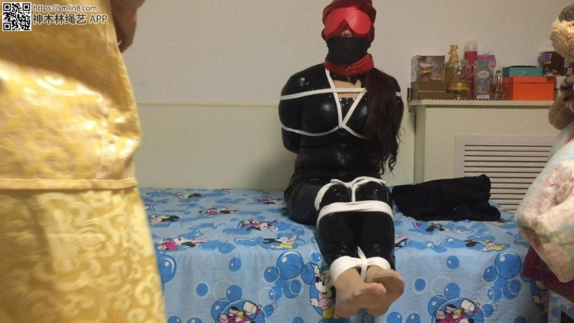 把妖妖捆绑后,本来是想用口塞堵嘴的 但是她嘴太小含不住(樱桃小嘴哈),没办法了,反正蒙着眼睛看不到