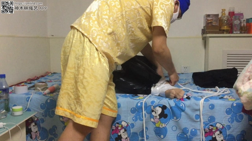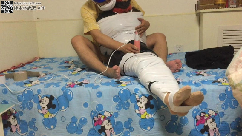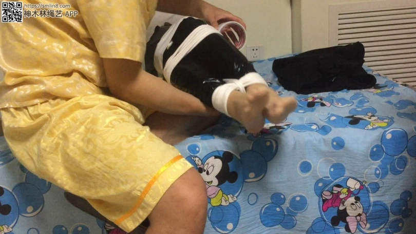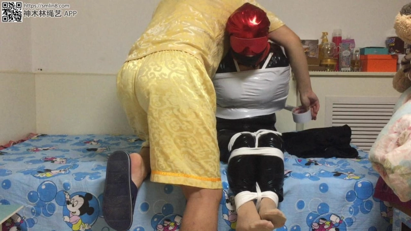 拿出她没洗过的丝袜塞进她嘴里,塞的时候她还不知道,快速用绷带缠几圈,在用胶带开始木乃伊捆绑,一圈又一圈,直到缠住双脚。