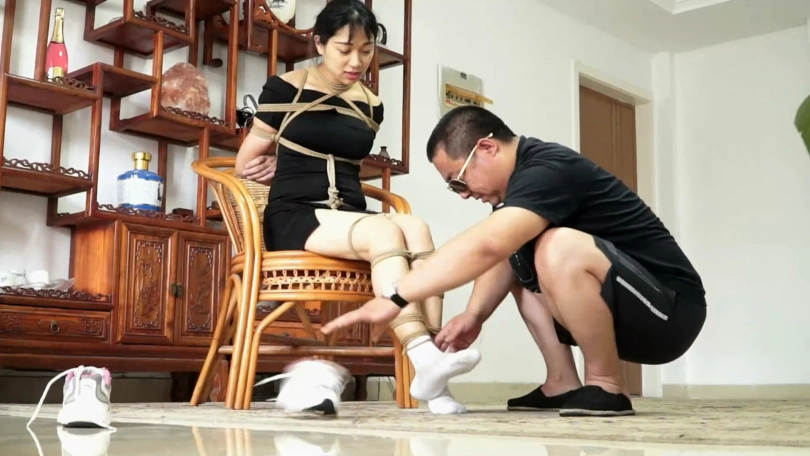老张让王蕾坐在椅子上扭动挣扎了一阵,然后蹲下身解开她脚上的运动鞋鞋带,脱掉白袜子,让她坐在椅子上,老张得意的欣赏着自己的作品。