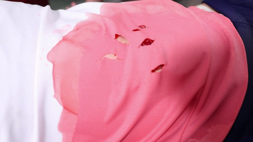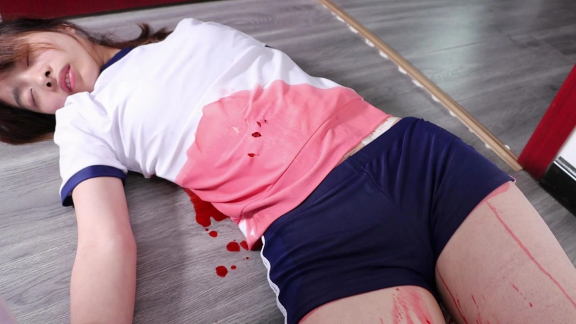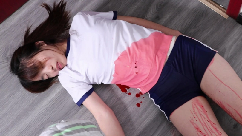 女主蜷缩躺在浴室里,腹部和周围地板上流了许多血。