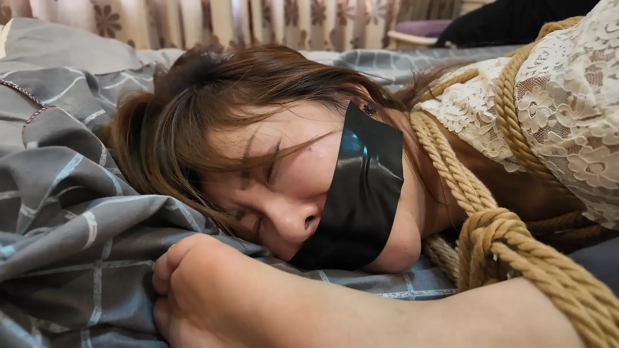 过了一会儿,母女两人被推搡着走出卧室,小智抓住机会撞到了房东想要逃走,但长时间的捆绑让她双脚无力,摔倒在了地上。房东将小智抱起扔在了沙发上,重重的锤击小智的腹部,为了让小智长点教训,房东端来一盆水,强制将小智的头按入水中,经受呛水惩罚后的小智彻底没了抵抗能力,一旁的米粒因为嘴上戴着口球,只能无助的看着女儿被虐待,无法开口求情。