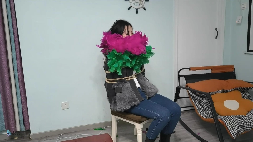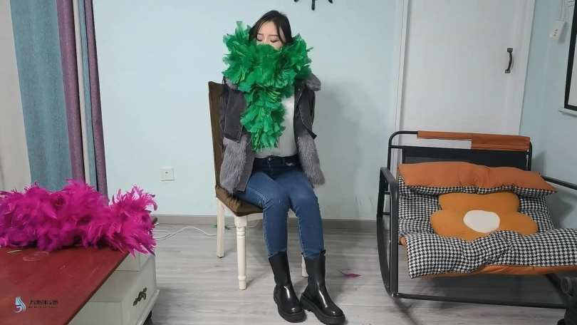 摄影师决定解开哈妮的嘴,并告诉她,她真的需要被绑起来卖这个表演,因为他更认真地把她绑在椅子上,并调整了羽毛围巾。当她抱怨并告诉他这真的很痒时,摄影师拿起第二条围巾,用它撕开她的嘴。她讨厌挠痒痒,并试图堵住谈话和抱怨,但这对她来说非常困难。她甚至试着把它吐出来,在外套的毛皮上摩擦,但它就是不松。她开始说更多的废话,更激烈地挣扎,她脖子上的羽毛围巾仍然在挠她,使她的整个脸和脖子非常痒。