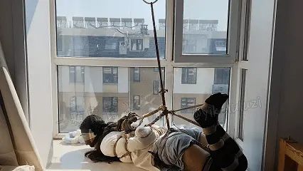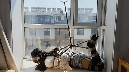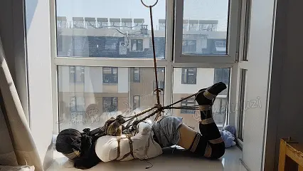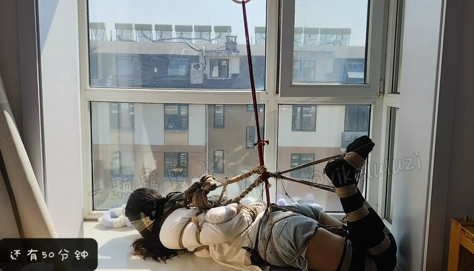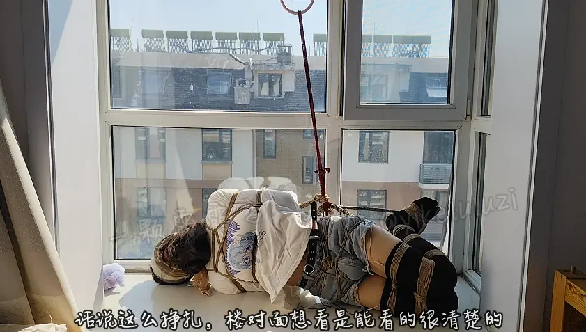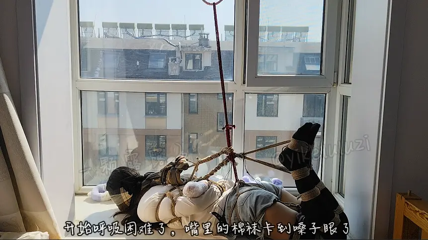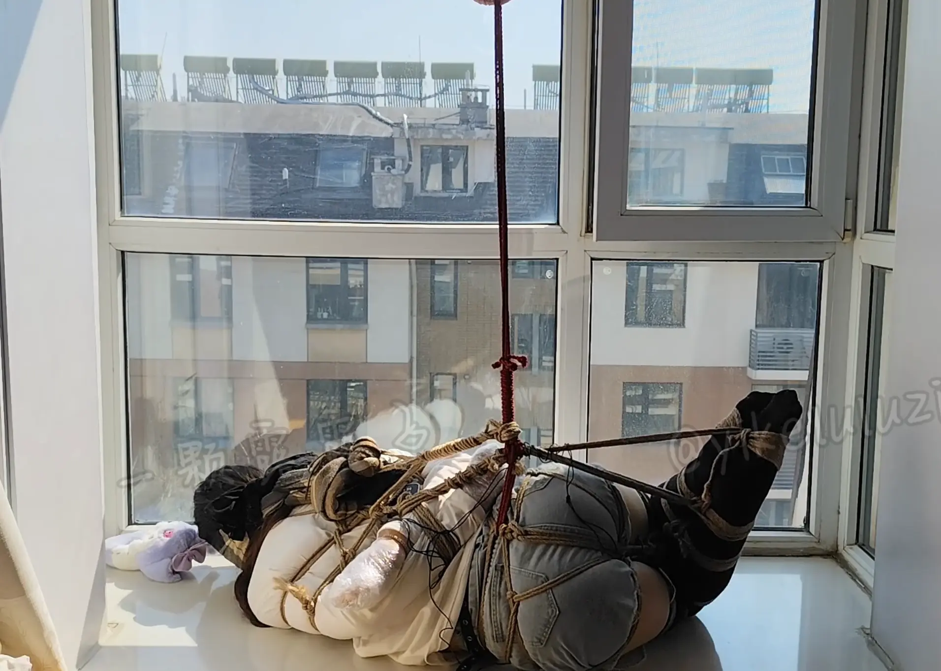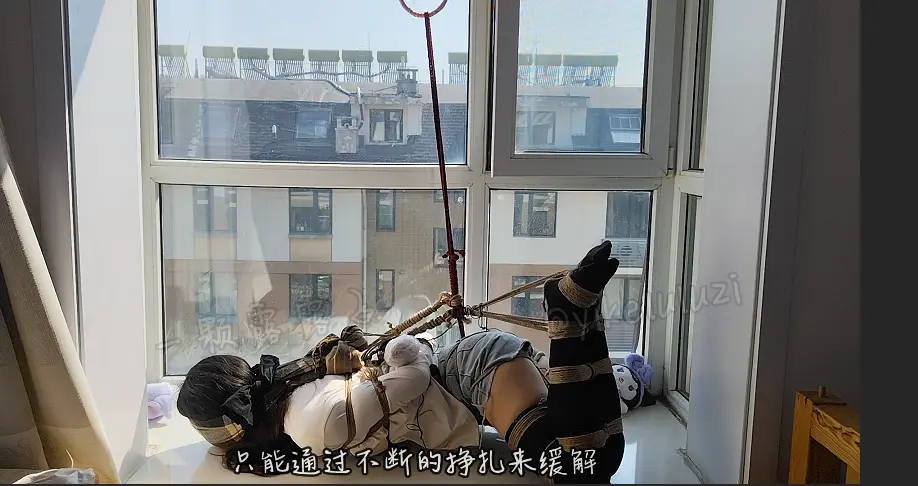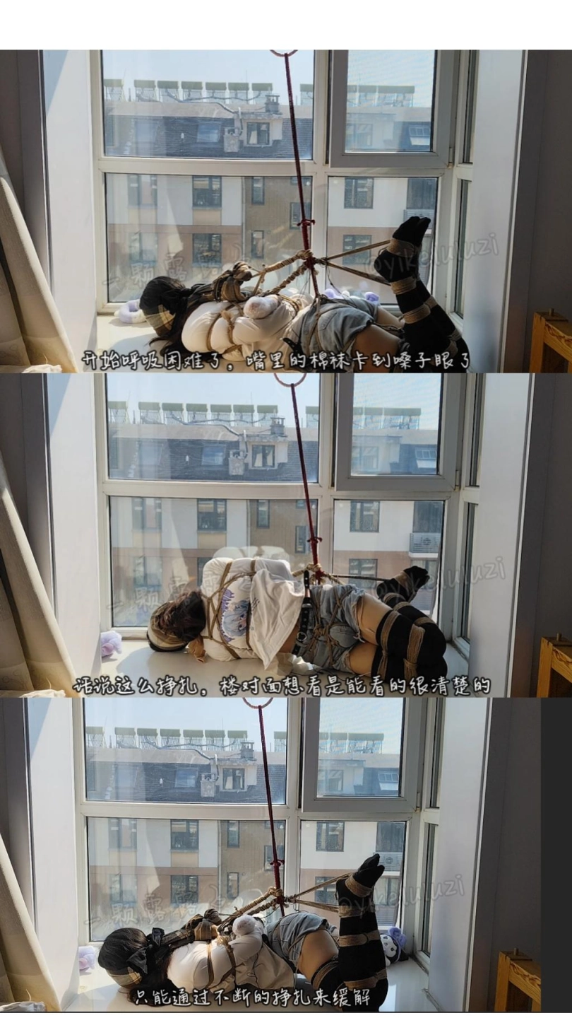 露露被超紧驷马放置,两双原味棉袜堵嘴,屁股和大腿设置100+的郊狼循环放置一个小时,驷马+吊环无法翻身只能阳台蠕动,多次想顶掉嘴里的异物棉袜却失败,中途干呕反胃。围巾勒住被胶带缠绕的眼睛无法轻易低头,郊狼电击不断肆虐,却只能无助的扭动。手掌被胶带缠成球状,没有任何可以自行挣脱束缚的可能。全身被绑在窗户下,能被楼下行人和对面楼的人看得一清二楚。嘴里想说的话全部变成呜呜声险些引来邻居(之后调解并无矛盾)。拍摄全程屋内无人,即便想呼救也无人应答。只能不断挣扎缓解身体的痛苦来等待他的救星…………