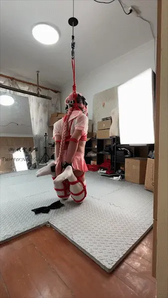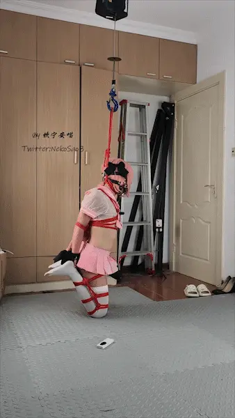 自缚!折腿跪立吊缚,脖子上的绳子挂在吊机上迫使身体直立,一旦放松就会被勒紧,但是在双腿折腿的情况下想要保持平衡又何其简单……更何况[X_X]还有一个凶猛的猛兽在不停地施加刺激,在不停地强高和试图保持平衡的挣扎中静静等得着定时锁的解锁……