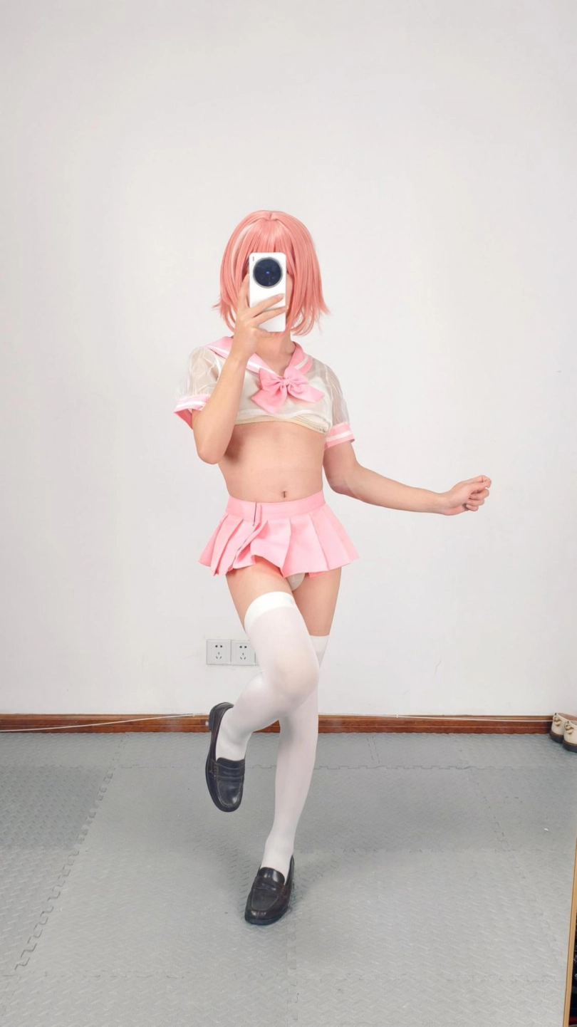 角色是阿福,经典男娘角色,搭配超短JK裙和半透的上衣,又涩又可爱~