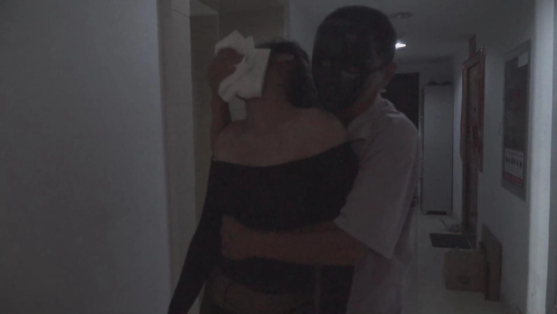 男子和女孩分开了,女孩正在一个人在昏暗的走道里步行。一个黑面人忽然出现,用一块沾满