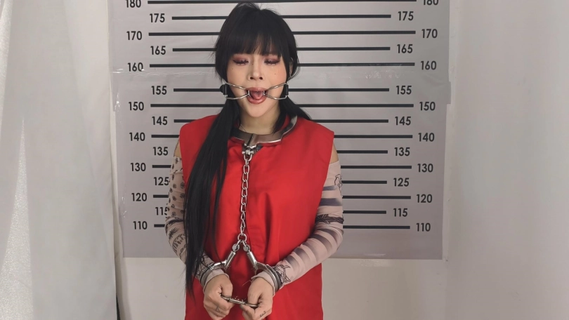 【忘忧社】女犯带手脚连铐颈手铐拇指铐被判死刑,带口环指认现场口水哗哗流,为了惩罚她这样罪大恶极的凶犯,给她后手吊高铐脖子靠墙锁住,疼的女犯直哼哼。
