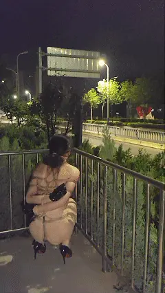 随时都有行车经过,一览露露的风光。全身紧紧捆绑的露露脚下的高跟鞋高达10CM,从未穿过高跟鞋的露露感到痛不欲生,是一种虐足的体验,随后在天桥上因为被肛钩顶的太舒服下跪,被电击到走不动路直接瘫倒在天桥上,来往的车辆稍加注意便注意到一个全裸的少女全身捆绑的躺在地上抽搐————