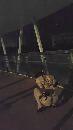 视频拍摄期间多次有行人,汽车,电动车路过,每次相遇都是惊心动魄,害怕被发现,全裸的姿态还被绑成如此模样露出每一分钟都是超刺激的感觉。先是从天桥上郊狼乘坐电梯,露露在强忍痛苦下用无力的小拳头敲下电梯按钮,随后上了电梯,出来是宽阔的大道,