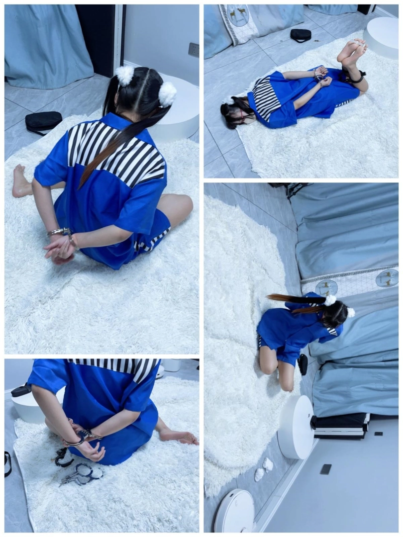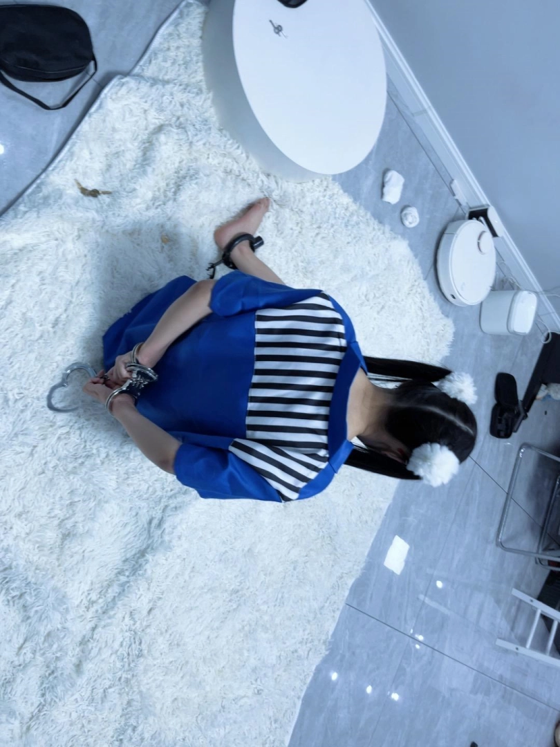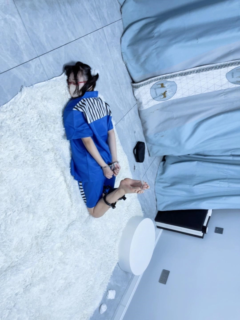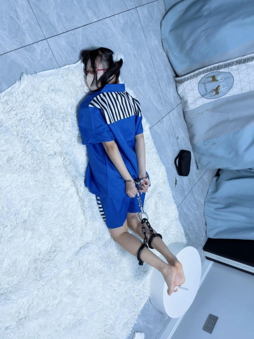 一夜过去,绑脚趾的扎带已经被糖糖挣脱开,不过手上的板铐反铐(锁眼朝上),脚上的镣铐和连接手脚的手铐还因为没有钥匙牢固的佩戴着。