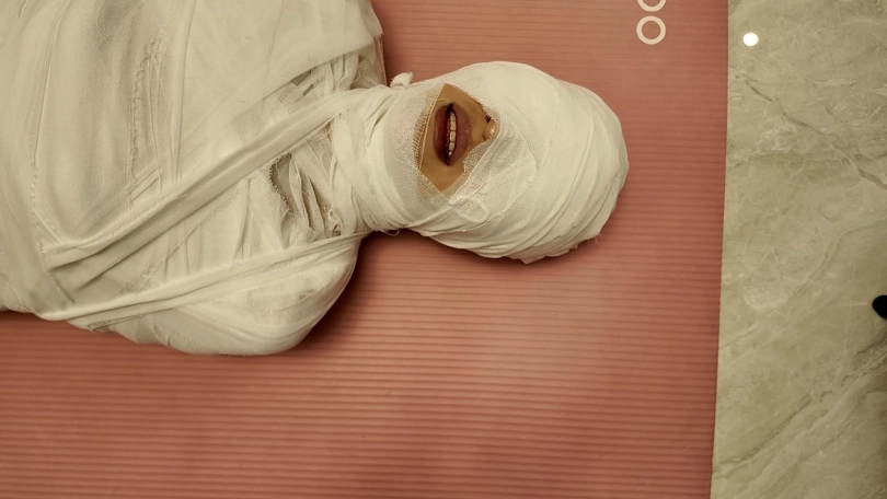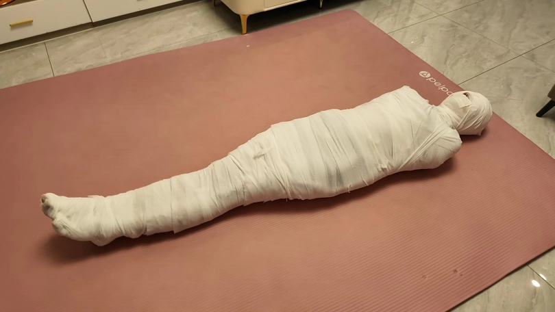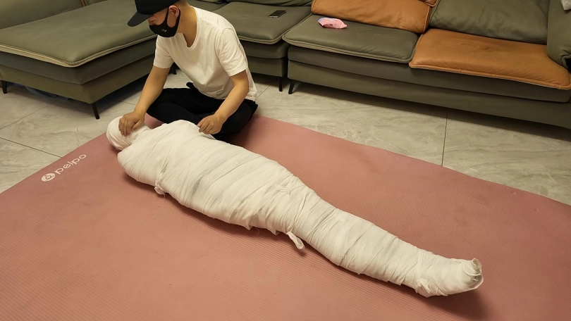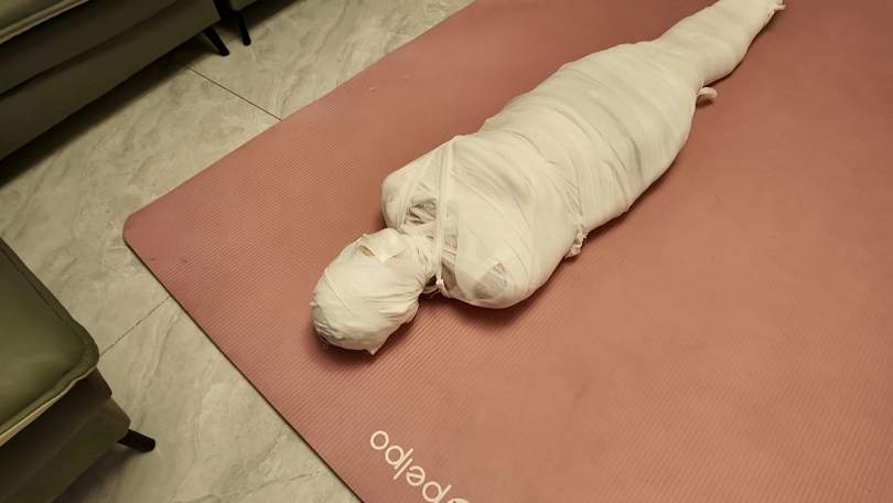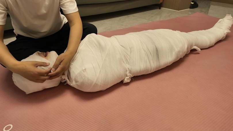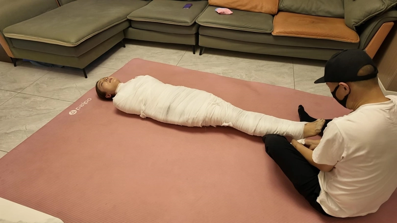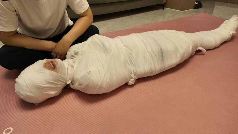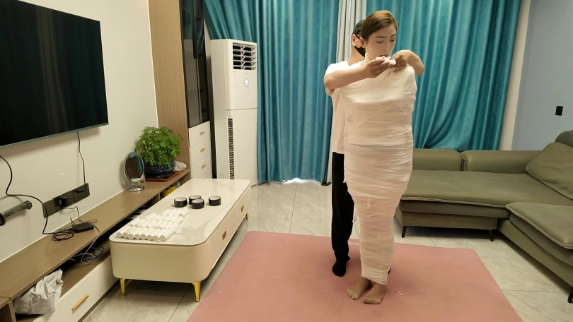 第一次和佳佳玩木乃伊,这次是佳佳主动要求的,绷带已经买了了好久了,偶然之间她看到了,问我是干啥用的,告诉她是玩木乃伊用的,就一直想玩,不过她没有想到不是单单缠绕起来,里面是要放跳D的,缠好,留出嘴巴,因为要听她呻吟,先用胶带粘上,这下就由不得她了,一直玩到没电,因为时间太长,所以分了上下两集,最后问她,高超了无数次,太刺激了