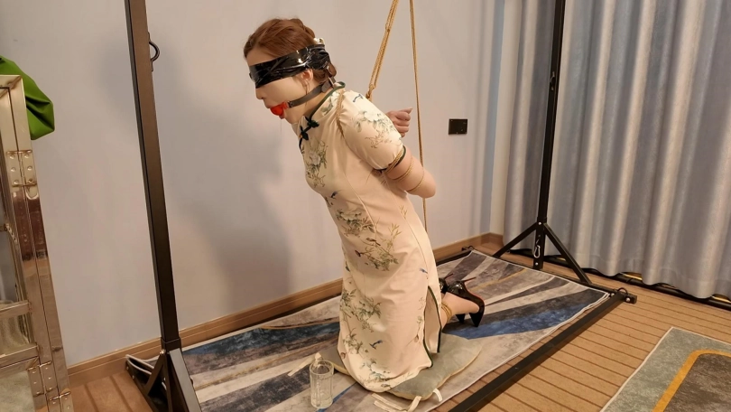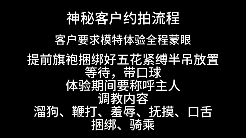 接神秘客户电话:预约佳佳定制体验、要求全程蒙眼、不许看到客户面容,旗袍五花捆绑,静电胶带蒙眼,带口球半吊跪在房间等候、体验过程全程称呼主人、体验内容,捆绑,遛狗、鞭打、羞辱、抚摸、口舌、骑乘