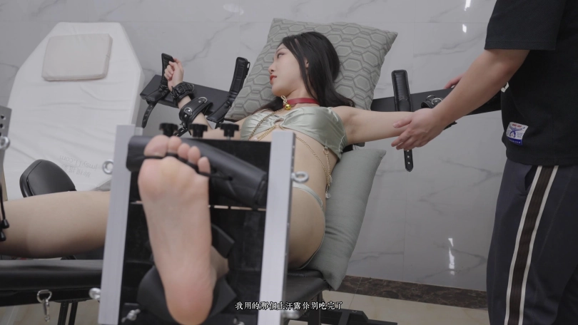 然后两个主人把她绑到椅子上,一边挠她一边天她的腋下。