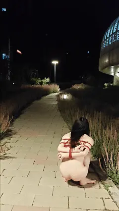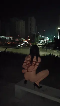 在解开脚上的束缚后,不知廉耻的露露把[X_X]对准了车流涌动的路上,之后在夜色中高跟鞋的声音哒哒哒哒的很是清脆,在走到一处明亮的地方后,露露被蒙上双眼,衣不蔽体的展示自己被捆绑的身体,在双目失明的状态下只能一步步小心挪动,最后躺在地上张开了双腿———————
