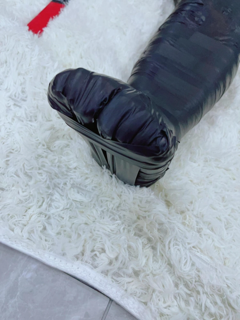 另外一个看点就是脚底。我在包裹脚底的时候特意问了模特要紧一点还是松一点,妹子决定紧一点。于是我选择了把脚趾脚底都绷紧的包法——隔着胶带依然能看到清晰的脚趾绷紧的纹路,完全失去站起来移动的可能。