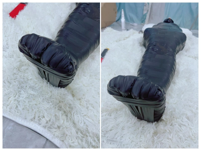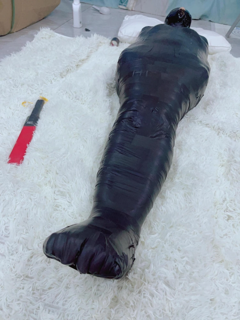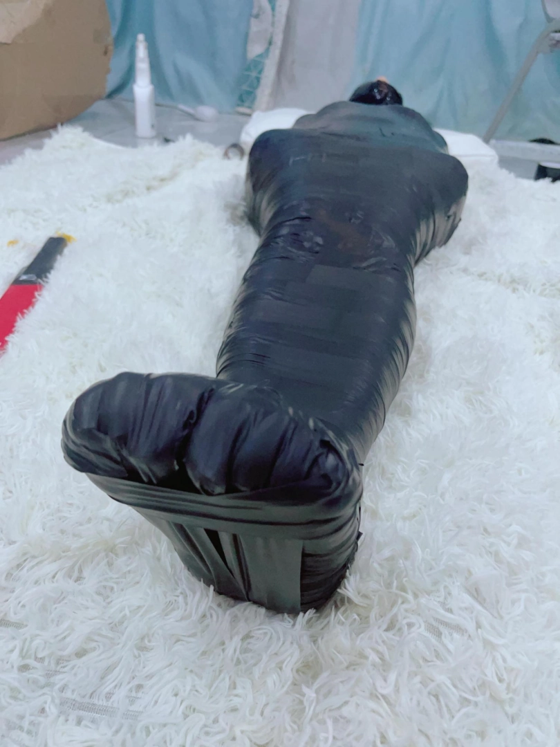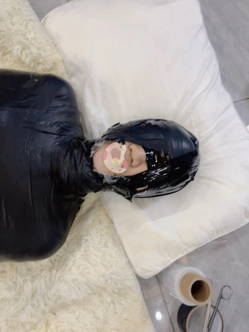 内容:作为上半部分,首先展示的是完整的全包过程。用保鲜膜打底后,贴上胶带。值得一提的是模特口中还带了奶嘴口塞,然后用保鲜膜和胶带封住头部。我选择了更复杂的胶带封头而不是头套,希望解开的困难可以给模特带来更严厉的心理体验。
