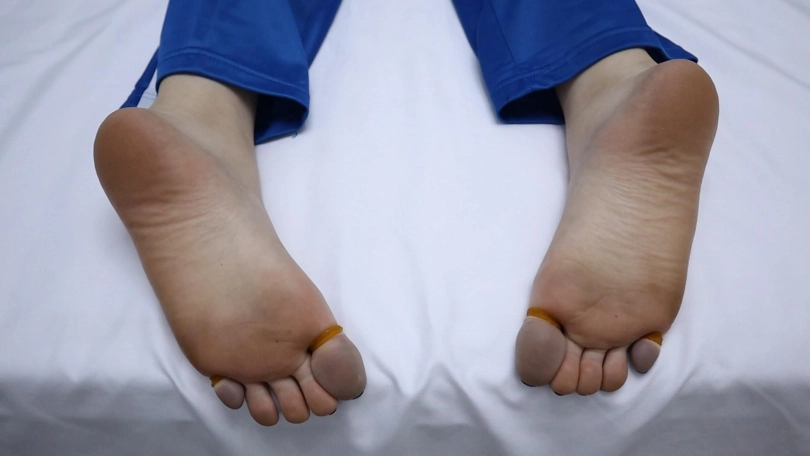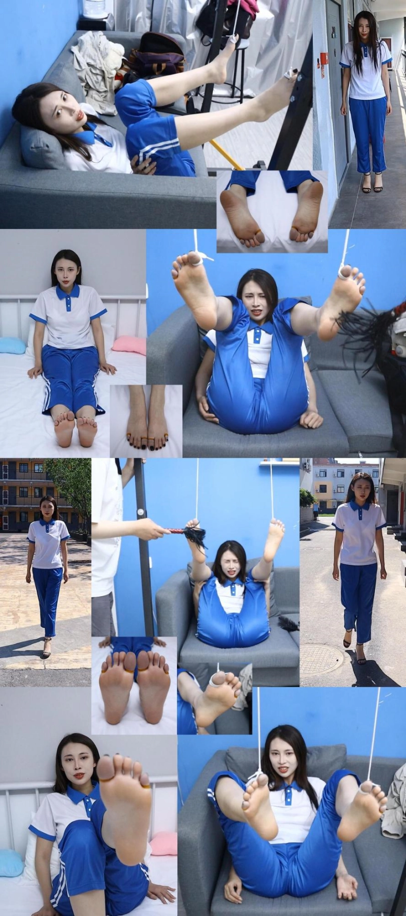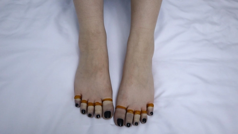 用皮筋牢牢捆住妹子的大脚趾和小脚趾,然后把脚趾吊起来,做出如此羞耻的动作,还有户外高跟鞋行走尝试,真的是超级刺激超级疼!!!刚绑上3分钟妹子的脚趾就紫了,拍到最后都已经颜色惨白没有知觉了,妹子表示超级疼超级疼!!!