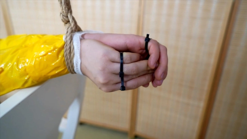 1.用胶带把胳膊直臂缠起来,手指头用扎带收紧后,再用胶带束缚