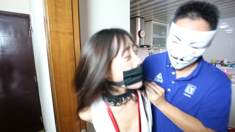 没一会,美女忍者的助手到了,助手很好奇她跑厨房来搞什么,他把女忍者搀扶出去,美女当然记得大叫,不停示意,但被双重堵嘴的她一个字都说不出来。她被强行搀出了厨房。
